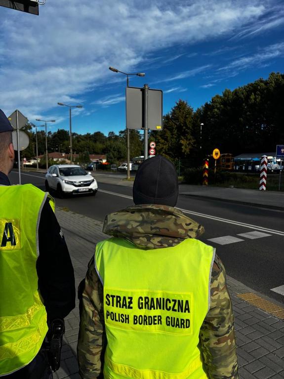 Policjanci wspierają funkcjonariuszy Straży Granicznej w działaniach prowadzonych na przejściu granicznym. Wspólna obecność służb ma na celu zapewnienie bezpieczeństwa mieszkańcom oraz osobom podróżującym przez granicę.