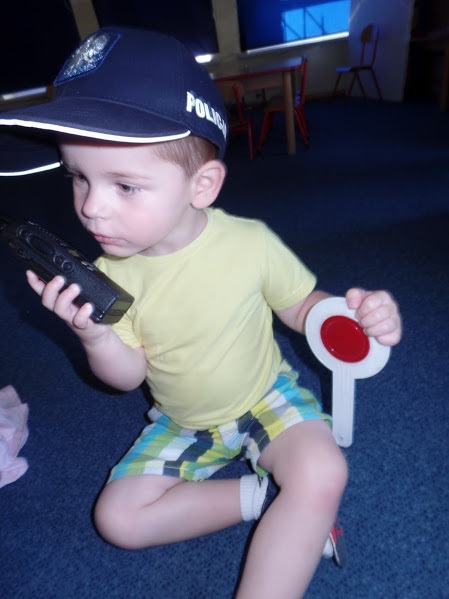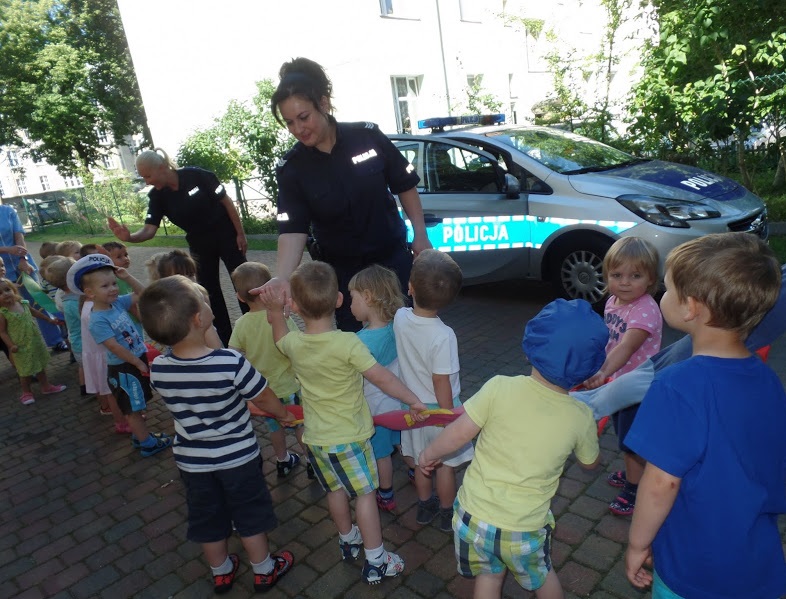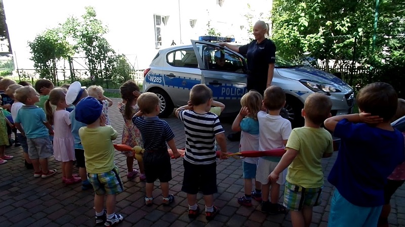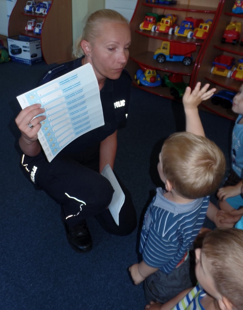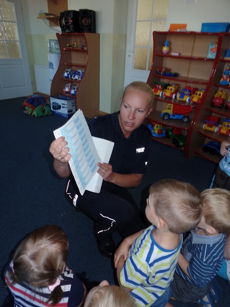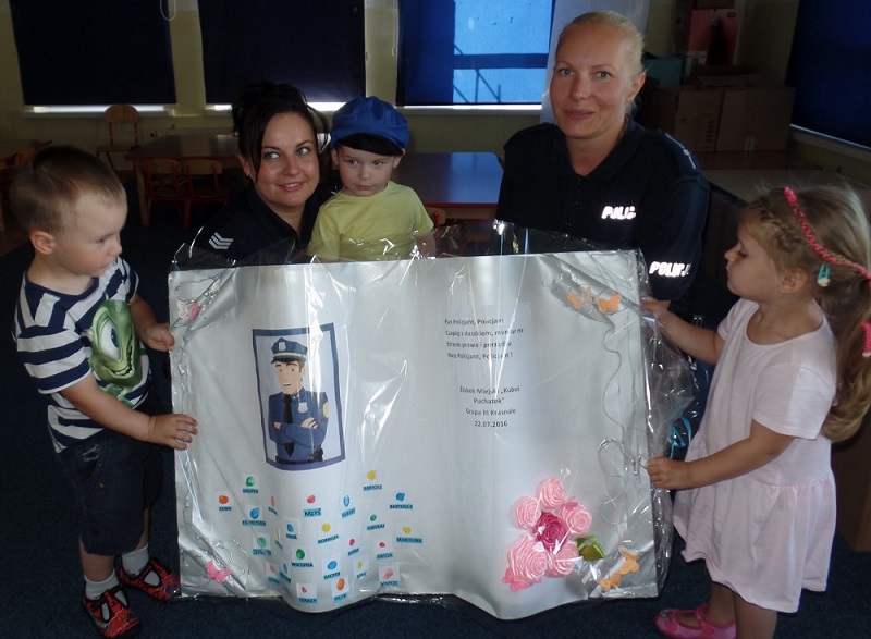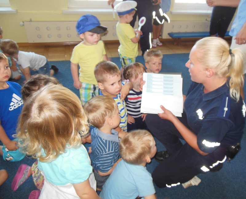 Maluchy żywiołowo zareagowały na wizytę policjantów, witając ich piosenką na ustach. W trakcie spotkania z dziećmi omówiono zasady bezpiecznego przechodzenia przez jednię i prawidłowego korzystania z sygnalizacji świetnej. Krasnale doskonale wiedziały, że kiedy przechodzą przez jezdnię podnoszą rączkę do góry, rozglądają się czy nie nadjeżdża pojazd. Dzieci wykazały się również wiedzą na temat bezpieczeństwa podczas jazdy samochodem, w tym niezbędnego korzystania z fotelików ochronnych i zapiętych pasów bezpieczeństwa. Zwrócono uwagę kilkulatków na konieczność ubierania elementów odblaskowych, które niejednokrotnie mogą uratować im życie. Nie zabrakło tematu dotyczącego sposobu postępowania w przypadku, kiedy dziecko zostanie zaczepione przez obcą osobę, która może poczęstować słodyczami lub prezentami.