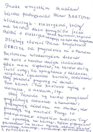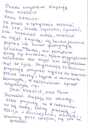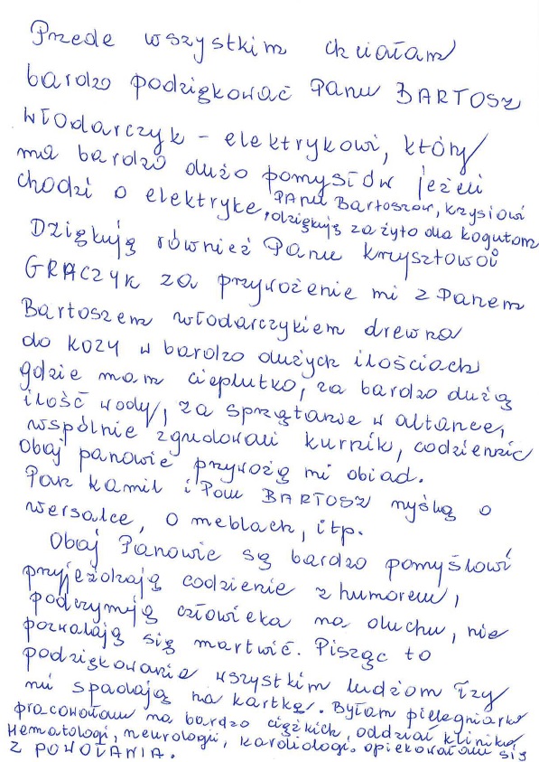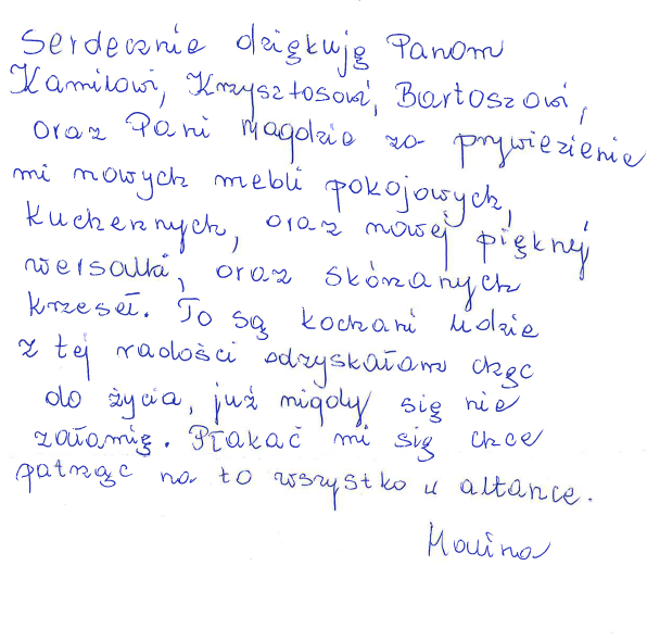W tym miejscu chcemy przekazać szczególne podziękowania, które płyną prosto z serca Pani Haliny. Z ogromną wdzięcznością dziękuje ona Panu Bartoszowi Włodarczykowi oraz Panu Krzysztofowi Graczykowi, Pani Magdzie Brzezińskiej, a także sierż. szt. Kamilowi Zwierzchowskiemu.