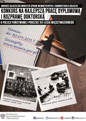 - Konkurs na najlepszą pracę dyplomową lub rozprawę doktorską na temat polskiej Policji Państwowej Posiadasz lub ubiegasz się o tytuł licencjata, magistra albo doktora na polskiej uczelni? Interesujesz się historią? Weź udział w ogłoszonym przez ministra Mariusza Błaszczaka konkursie prac na temat polskiej Policji Państwowej w XX-leciu międzywojennym. Do wygrania nagrody pieniężne.