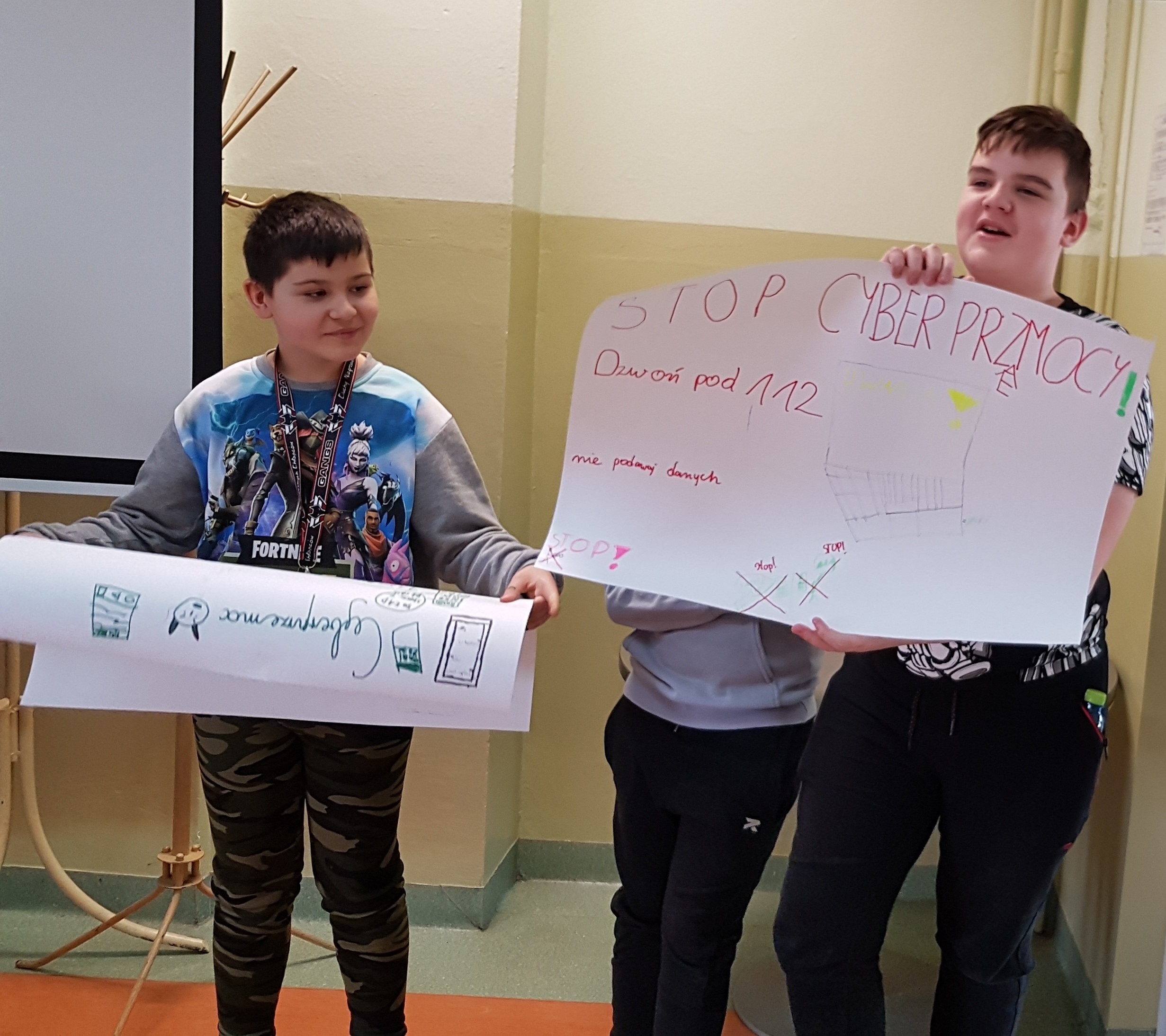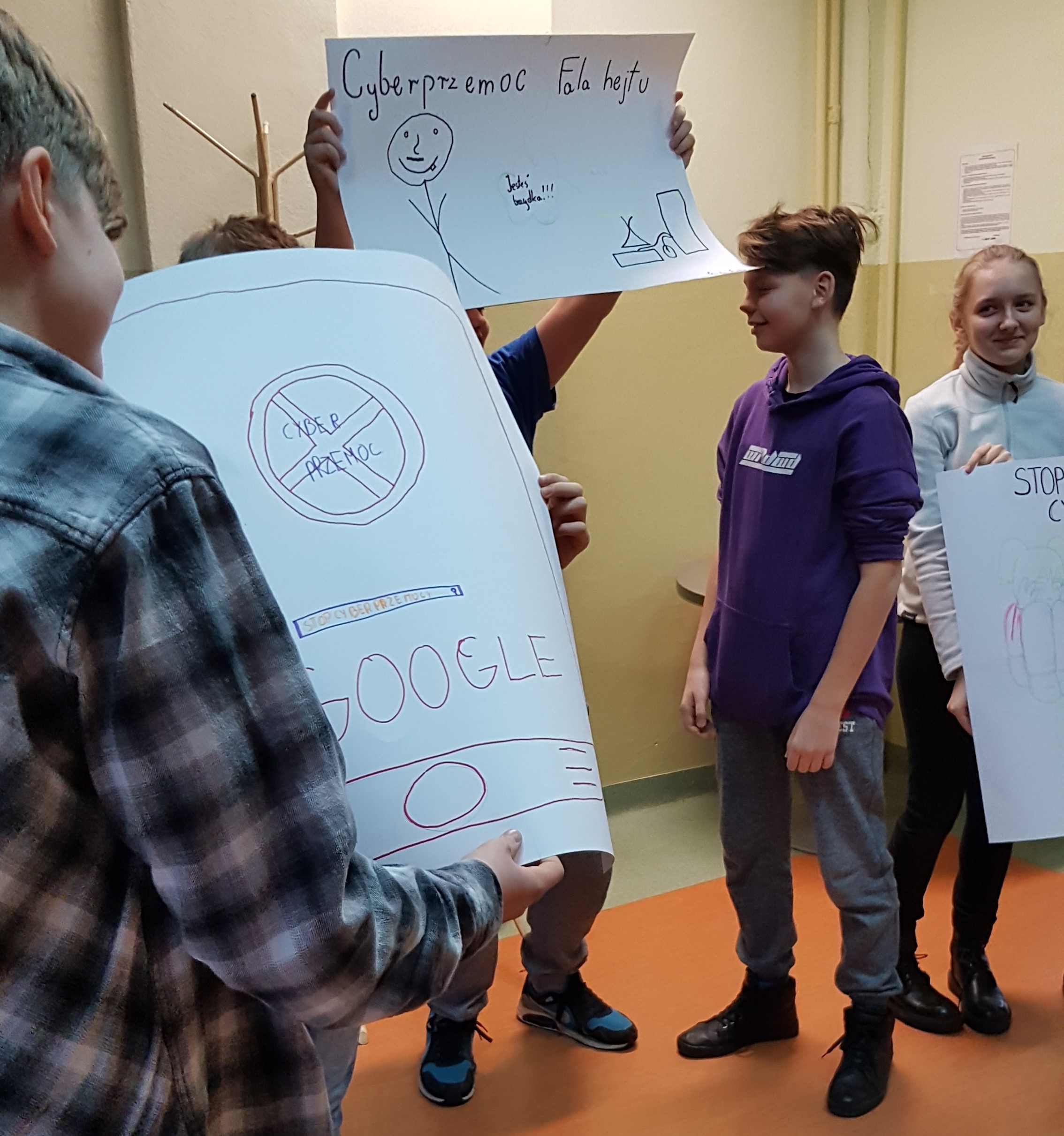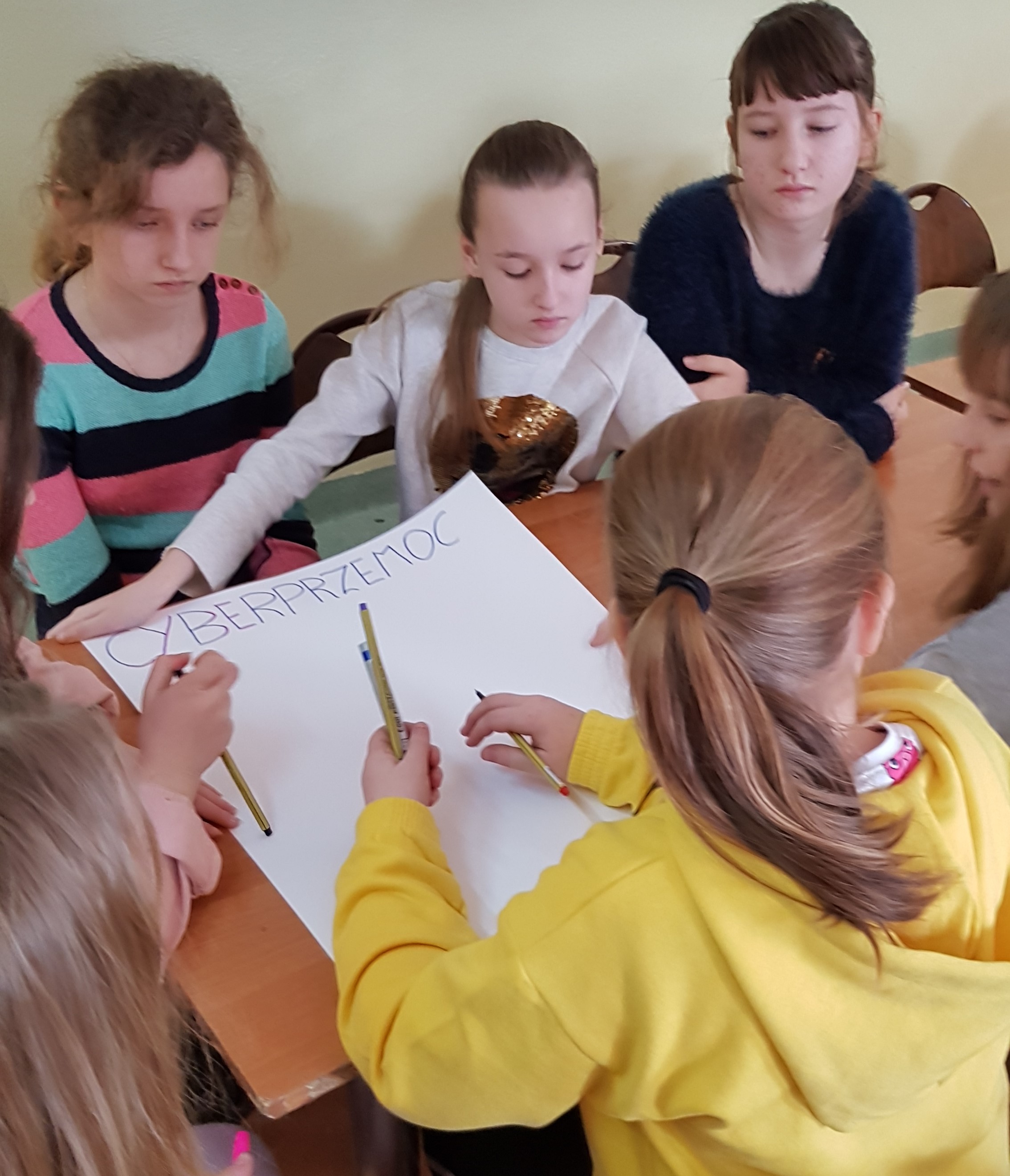 Uczniowie aktywnie uczestniczyli w spotkaniach, chętnie dzielili się swoimi spostrzeżeniami. W trakcie zajęć malowali plakaty dotyczące cyberprzemocy i zagrożeń z nią związanych.